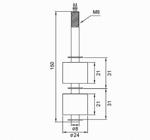 液位传感器重要由磁簧开关和浮球组成,浮球内有磁性材料,在密闭的非导磁金属管或塑料管内设置一个或多个磁簧开关,然后将导管穿过一个或多个带有磁性材料的浮球,并利用固定双环控制浮球与磁簧开关在相关位置上,浮球随着液体上升或下降,利用球内磁铁去吸引磁簧开头的接点,产生开与关的动作,作液位控制或指示(当浮球靠近磁簧开关是导通;离开时开关断开)。